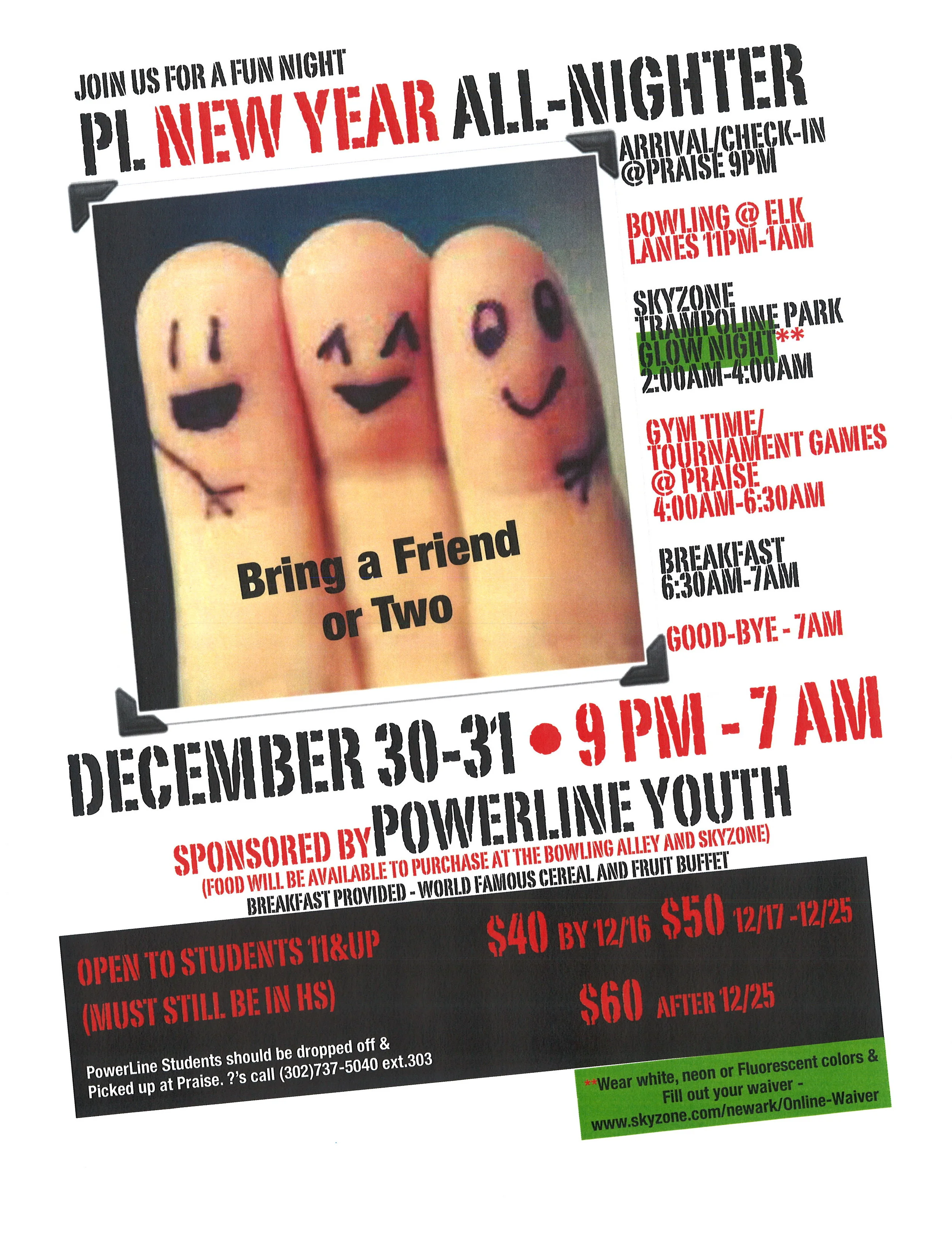 *Wear white, neon, or fluorescent colors and fill out your waiver.