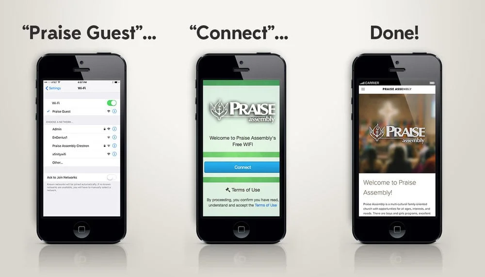 We're working on improving our WiFi for you. You'll notice that some things have changed recently. You no longer need a password to get onto our network. Simply go to your browser or your settings page and select "Praise Guest". You'll be asked to "Connect" and you'll then be online.